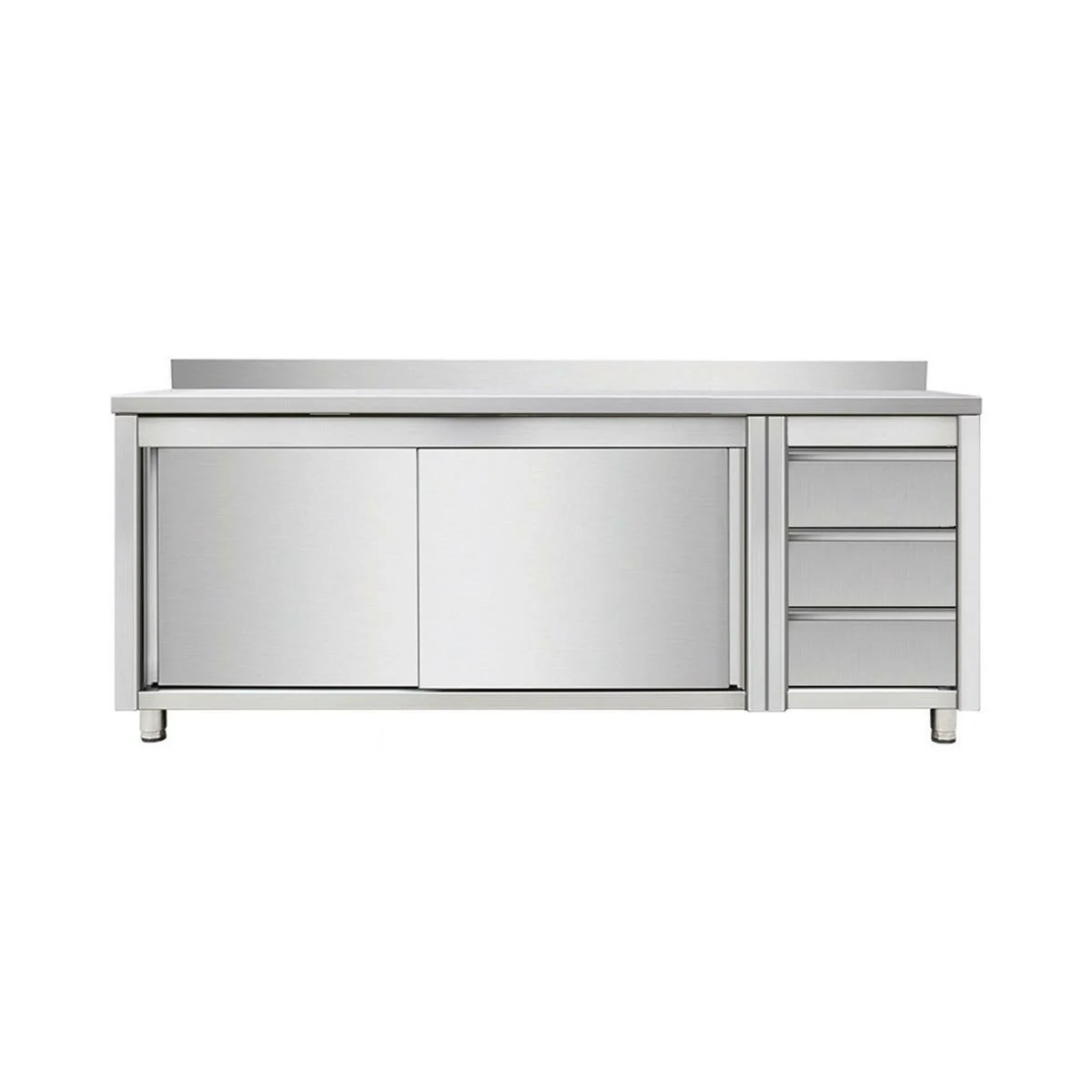 Arbeitsschrank mit Schiebetüren und Schubladenblock rechts, mit Aufkantung, Edelstahl – 1600 x 700 x 850