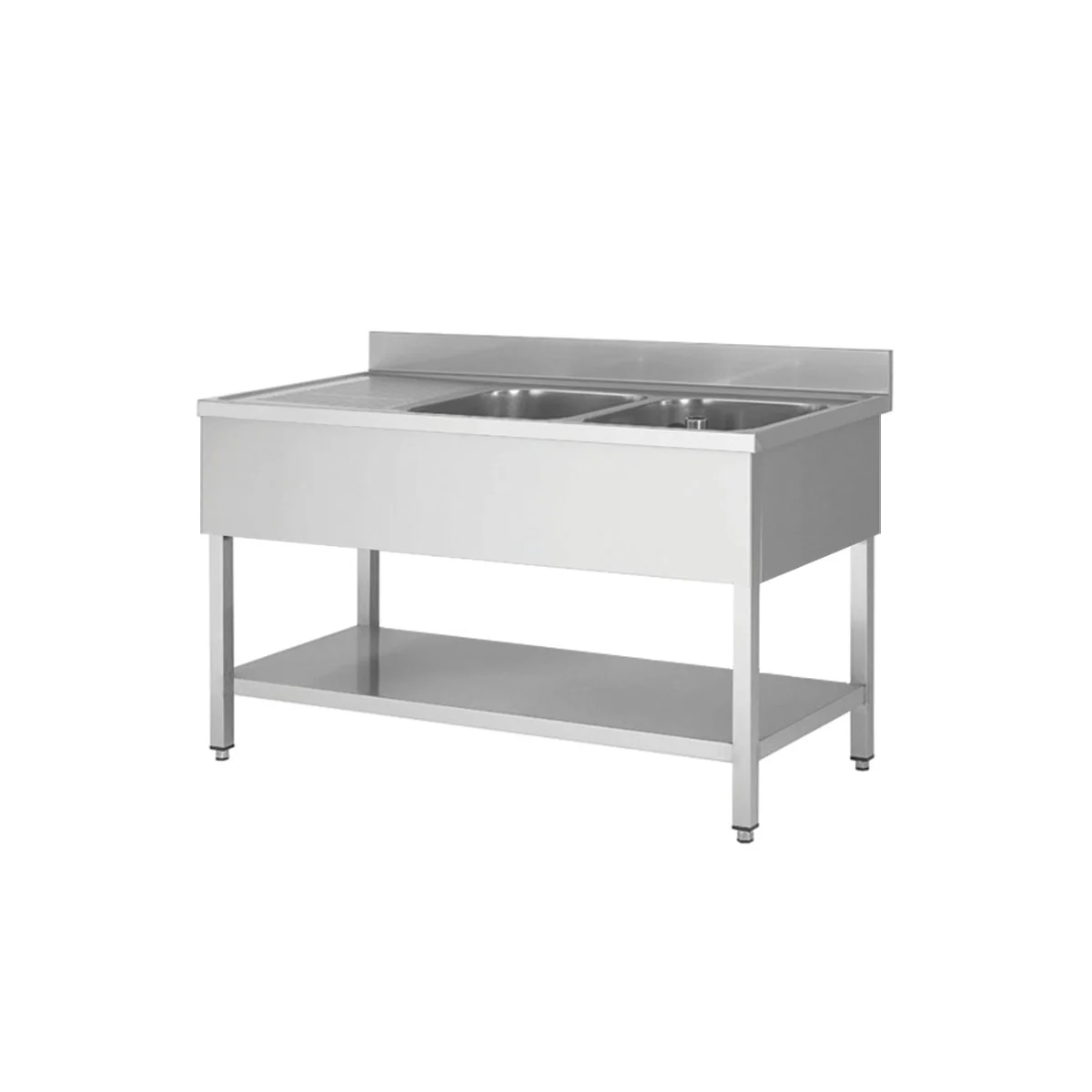 Spültisch aus Edelstahl, zwei Becken rechts, 140 x 60